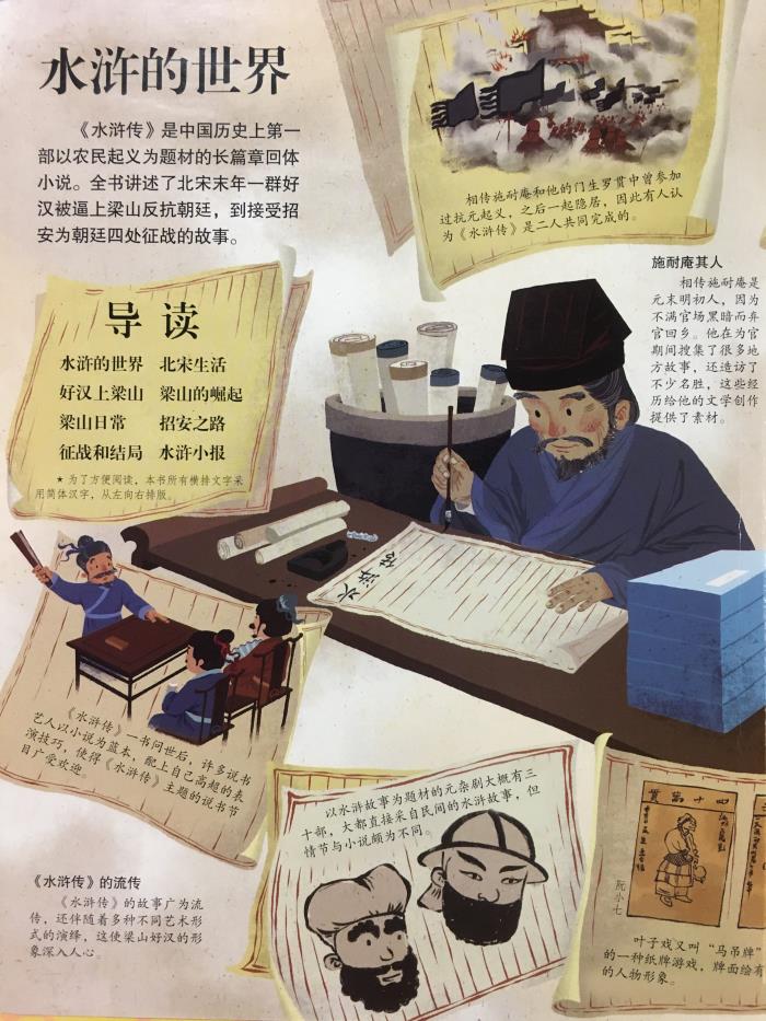 《揭秘水浒传》是一本面向儿童的古典文学名著入门翻翻书。内容包括水浒的世界、市井生活、好汉上梁山、梁山的崛起、梁山日常、招安之路、征战和结局、水浒小报等,通过精美的插画和逻辑性极强的设计,帮助读者快速、全面的了解小说的创作背景,故事的行文脉络以及相关的文学常识等,引发小读者的对于名著作品的阅读兴趣。让孩子先人一步迈入伟大古典文学的殿堂!本书对原著中的故事情节和人物关系进行了梳理,引导小读者更加全面的理解原著的故事信息,提高语文学习的自信,降低之后阅读名著的门槛和难度。此外,本书寻找优秀青年插画师合作,辅以最能激发小读者兴趣的翻翻页设计,让孩子亲近名著,爱上名著,从名著中获得人格和学识的滋养。