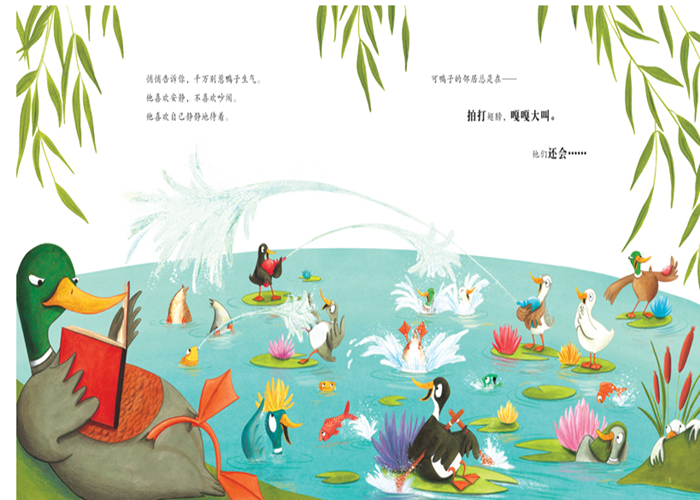 “嘎嘎嘎!” 别再叽叽喳喳!别再嘈嘈杂杂!别再吵啦! 受不了吵闹的鸭子出发了,去寻找一个安静的池塘。 他只想独自待着。他真的不想再被打扰了。 鸭子拎着行李出发了,他上高山下洞穴,经历千辛万苦,终于找到了一个完美的池塘。真不幸,池塘里已经有别的小伙伴了……