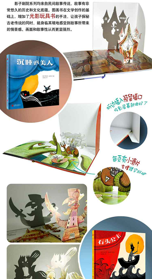 影子剧院系列均来自民间故事传说。故事有非常悠久的历史和文化底蕴。图画书在文学创作的基础上,增加了光影玩具书的手法,让孩子探秘古老传说的同时,能身临其境地感受到故事所带来的情景感。画面和故事性从而更显强烈。