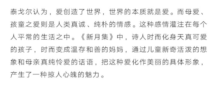 《泰戈尔写给孩子的诗(新月集)/诗美绘双语阅读》满足多种阅读需求图文搭配浑然天成,美入心扉!舒适安全,颜色适中,保护孩子眼睛扫一扫即可听到原汁原味的英文诗歌是文学爱好者的礼物,适合收藏!罗宾德拉纳特·泰戈尔认为,爱创造了世界,世界的本质就是爱;而母爱、孩童之爱则是人类真诚纯朴的情感;这种感情灌注在每个人平常的生活之中。《新月集》中,诗人时而化身天真可爱的孩子,时而变成温存和善的妈妈,通过儿童新奇活泼的想象和母亲真纯怜爱的话语,把这种爱化作美丽的具体形象,产生了一种掠人心魄的魅力。