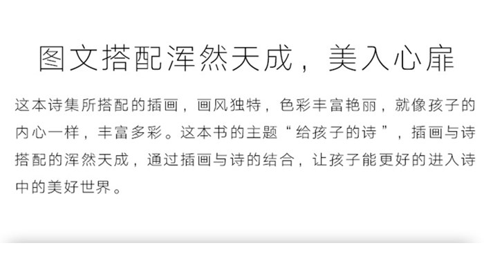 一书多用,满足多种阅读需求 图文搭配浑然天成,美入心扉! 舒适安全,颜色适中,保护孩子眼睛 扫一扫即可听到原汁原味的英文诗歌 是文学爱好者的美好礼物,适合收藏