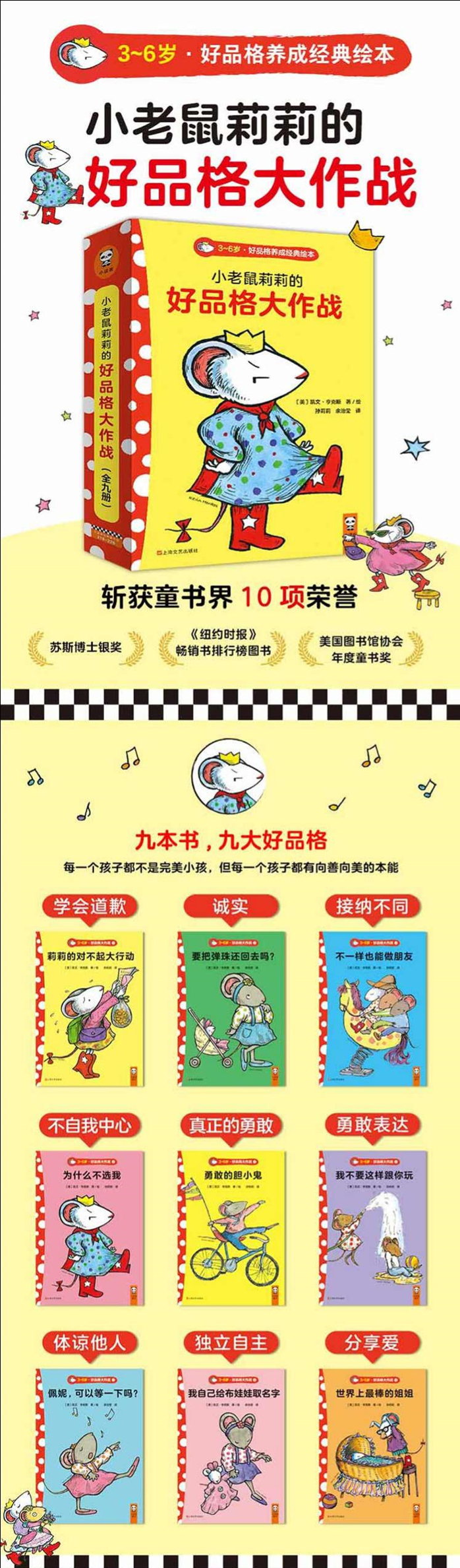 《小老鼠莉莉的好品格大作战(3~6岁·好品格养成经典 套装全9本)》是美国知名童书作家凯文·亨克斯创作的经典绘本,讲述了一个可爱的小老鼠主人公佩妮平时的生活。绘本从小佩妮的出生开始讲起,慢慢涉及其与家庭成员的关系、邻里关系、同学关系、师生关系,还讲述了她与小伙伴们之间发生的有趣故事,很有治愈力。