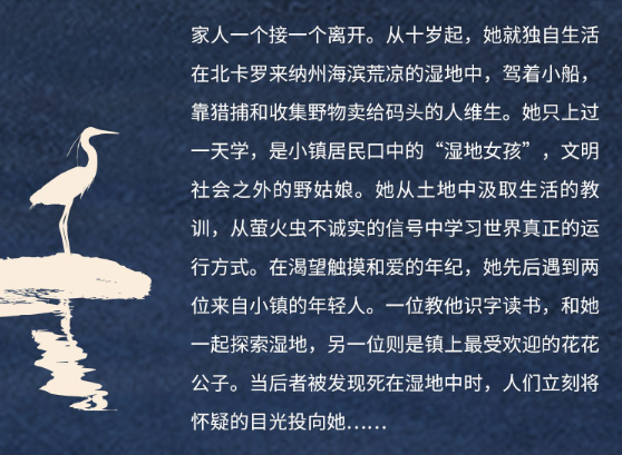 家人一个接一个离开。从十岁起,她就独自生活在北卡罗来纳州海滨荒凉的湿地中,驾着小船,靠猎捕和收集野物卖给码头的人维生。她只上过一天学,是小镇居民口中的“湿地女孩”,文明社会之外的野姑娘。当镇上*受欢迎的花花公子被发现死在湿地中时,人们立刻将怀疑的目光投向她。 作为天生的湿地生物学家,她从土地中汲取生活的教训,从萤火虫不诚实的信号中学习世界真正的运行方式。到了渴望触摸和爱的年纪,受到两个来自小镇的年轻人的吸引,她向一种全新的生活开启了心扉…… 若干年后,她成了当地的传奇,小镇旅游业的名片。但这本书要讲的并不是一个女孩冲破重重阻碍走向光明的励志故事。荒凉的湿地养育了女孩,也塑造了她。她关于爱情和生活的选择听从的是荒野的召唤,而非文明社会的教导。