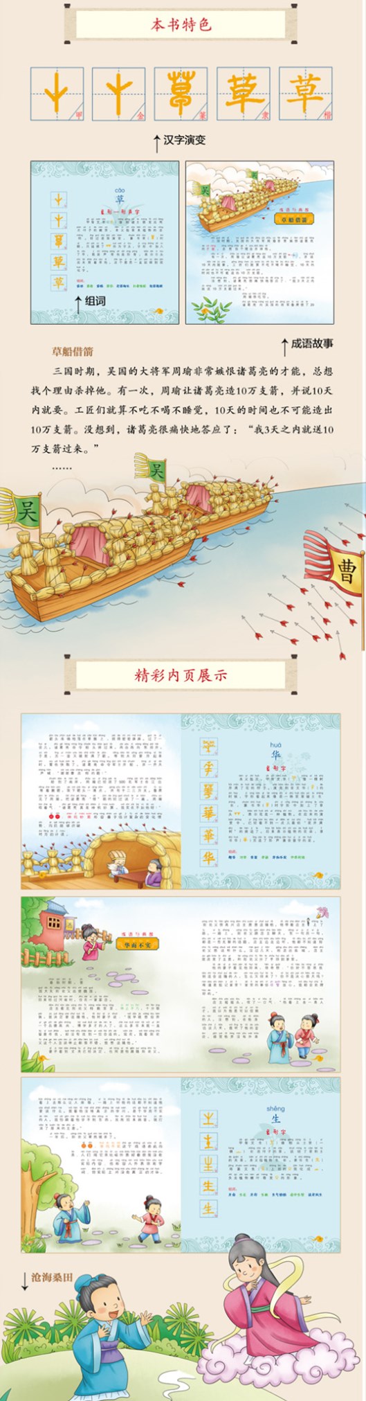 了解了汉字的造字和演变过程,你们会觉得,我们的汉字非常非常地亲切,因为它就来自天、地、你、我、他。而且汉字就是我们的生活。它是图像,可以画,更是诗篇,可以书写。从*开始的画汉字到书写汉字,它已经陪伴我们的祖先走过了几千年。它的演变记载了中华民族生生不息的历史和灿烂的文化。打开这套书,让我们开始汉字的寻根之旅吧!