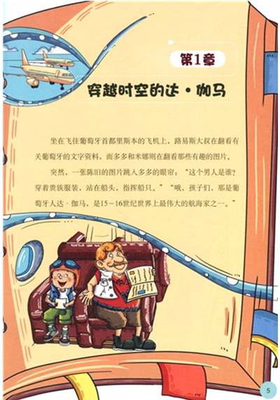 突然,一张陈旧的图片跳入多多的眼帘:“这个男人是谁?穿着贵族服装,站在船头,指挥船只。”“哦,孩子们,那是葡萄牙人达·伽马,是15~16世纪世界上最伟大的航海家之一。”路易斯大叔歪过头来对孩子们说。多多好奇地问:“达·伽马到过哪些地方?不会做了环绕地球的海上旅行吧!他真有那么伟大吗?”路易斯大叔解释说:“达·伽马没有做过环球旅行,但他从首都里斯本带着船队出发,沿着非洲西海岸,绕过了好望角,再沿着非洲东海岸,一直抵达印度,他的船队打开了西欧通往东方的海上通路,从此把东西方由海路上连通起来,这在当时是一件非常轰动的大事。所以在葡萄牙人的心中,达·伽马是一个大英雄。”米娜好奇地问:“我很奇怪,在达·伽马之前,难道从来没有人从海上到达过东方吗?”“没有,在达·伽马之前,葡萄牙航海家迪亚士曾经带着船队走过类似的路线,在到达非洲的好望角时,船队遇到了强大的风暴,付出了惨重的代价,于是迪亚士无奈地返回葡萄牙,这次海上探险以失败而告终。”路易斯大叔解释道。