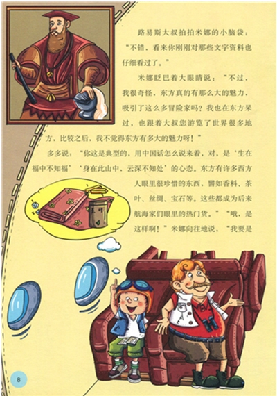 多多指着头像问路易斯大叔:“既然航海这么危险,为什么有那么多的航海家,像我知道的哥伦布、麦哲伦,还有这位达·伽马要这么疯狂地进行海上探险?”米娜皱着眉头说:“财富和冒险精神,应该是这些人的思想支柱吧!我刚才看过文字资料,有一个叫马可·波罗的人,他游历中国达17年之久,回国后在一次战争中被俘,在狱中由他口述他的狱友记录,创作了一部《马可·波罗游记》。据说这部书很快就风靡欧洲,所以在很多欧洲人的眼里,东方很神秘,很富有,是一个遍地黄金的好地方。因此,就激起了很多人的欲望,为了财富,很多冒险家开始尝试打通通往东方的海上之路。”路易斯大叔拍拍米娜的小脑袋:“不错,看来你刚刚对那些文字资料也仔细看过了。”米娜眨巴着大眼睛说:“不过,我很奇怪,东方真的有那么大的魅力,吸引了这么多冒险家吗?我也在东方呆过,也跟着大叔您游览了世界很多地方,比较之后,我不觉得东方有多大的魅力呀!”多多说:“你这是典型的,用中国话怎么说来着,对,是‘生在福中不知福’‘身在此山中,云深不知处’的心态。