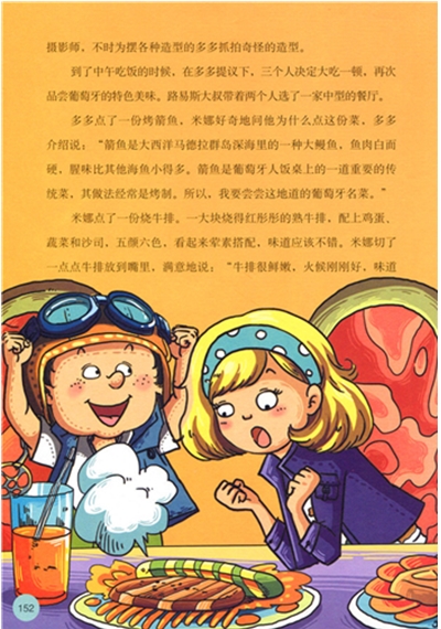 坐在飞往葡萄牙首都里斯本的飞机上,路易斯大叔在翻看有关葡萄牙的文字资料,而多多和米娜则在翻看那些有趣的图片。