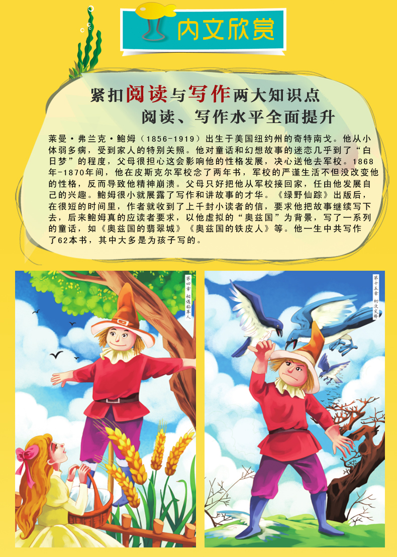 《绿野仙踪》是美国著名儿童文学作家莱曼·弗兰克·鲍姆系列作品《奥兹国经典童话》的开篇之作,也是知名的一篇。《绿野仙踪》出版于1900年,连续两年成为美国畅销童书。在之后的20年间,鲍姆陆续创作发表了一部又一部有关奥兹国的奇幻冒险童话故事,共十四本。这一系列在美国享有很好的声誉,是美国儿童文学协会(CLA)评选的“十部美国伟大的儿童文学作品”之一,也是美国全国教育协会(NEA)推荐的“zui佳童书之一”。《绿野仙踪》问世百年以来,被翻译成20多种语言出版,根据这个故事所改编的动画片、电影、舞台剧等更是不计其数。