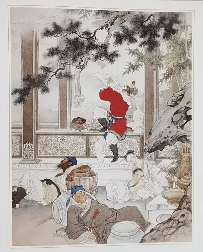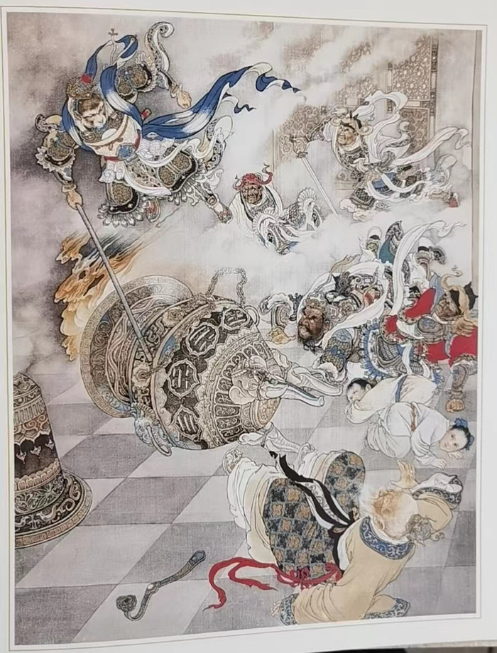《闹天宫》创作于50年代中期,1956年由人民美术出版社以年画条屏形式出版,是刘继卣工笔重彩作品的代表作之一,也是他艺术成就高峰之作。其中,孙悟空的造型不同于常见的戏曲脸谱形象,而是人格化了的富有机智勇敢个性的美猴王,灼灼的目光,坚毅的嘴巴,刚劲的臂腕,都表现出人物的特点;而天宫里的玉皇大帝、各路神兵天降,都有着不同的特点,令人感到他们既是神话中的人物,又是现实生活中的形象……