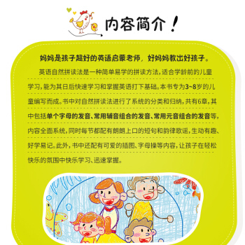 儿童英语启蒙教育是现在的很多家长非常关心的事,但市场上亲子类的英语启蒙书并不多见,仅有的一些启蒙书内容也不够系统。本书是《好妈妈胜过好老师:英语启蒙》系列中的一部,以讲解自然拼读法为主。本书依据儿童的学习能力和特点,用生动活泼的方式介绍自然拼读法,内容简单易懂,并将读、写、练有机搭配,方便孩子记忆和巩固。此外,本书还有专门写给妈妈的指导内容供妈妈们更好地与孩子互动学习。