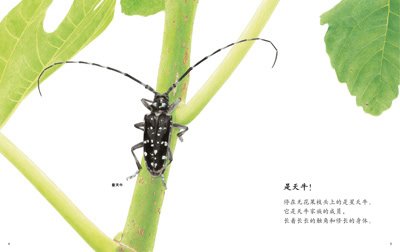 头顶着两根比身体还长的触角,拥有强而有力的大颚,看来一副凶恶样,这就是天牛。天牛的大颚是用来啃树皮、咬木头的;雌性的天牛还会用大颚在树干上挖洞,把宝宝产在里面。有些天牛还会吸花蜜呢。这些天牛的秘密生活,在《天牛》一书中作者都以写实的画风一笔笔地描绘出来,让我们有如亲临实境一般。