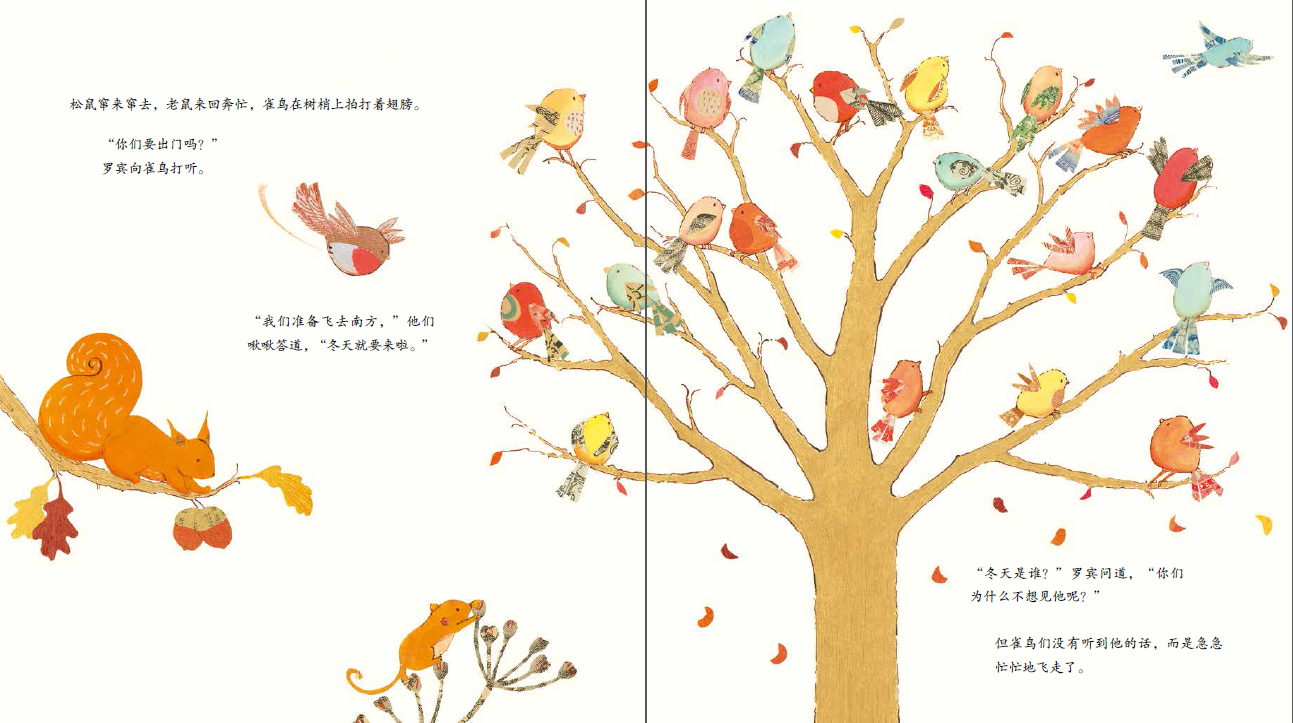 这是一本引人入胜的十分优美的图画书,通过一只小更知鸟罗宾的眼睛展示了不同季节的魅力。图画中有很多可以讲的内容,也有很多关于动物的小知识。比如:大熊说“睡一觉”冬天就过去了,就是一种对冬眠很有趣的介绍。在季节变化的时候,与孩子一起分享这个故事,可以让孩子和父母们去共同观察发生的变化,并且一起探讨他们在自然界中看到的景象。——LoveMYbook童书推广网站