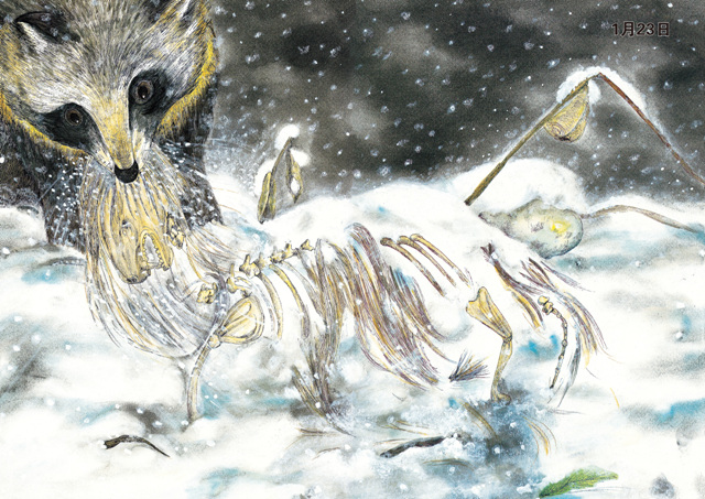 晚秋,一直小动物死了。不知从哪儿飞来的苍蝇钻进了它横躺在大地上的躯体里;黑尾叶蝉也开始在它身上晒太阳,蜘蛛则在它的皮毛里钻来钻去……