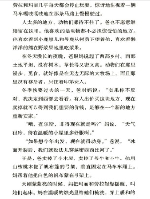 劳拉一家坐着敞篷车离开威斯康星大森林,跨越800多公里,迁徙到人迹罕至的堪萨斯大草原。他们一路颠簸经过了明尼苏达州、艾奥瓦州和密苏里州,驶过结冰的湖面,渡过惊险万分的激流,到了大草原,又遇到印第安人,遭受狼群围攻、草原大火和热病的侵袭,最后他们住进了爸爸亲手盖的温暖的小木屋中,在草原上度过了一段幸福美好的时光。