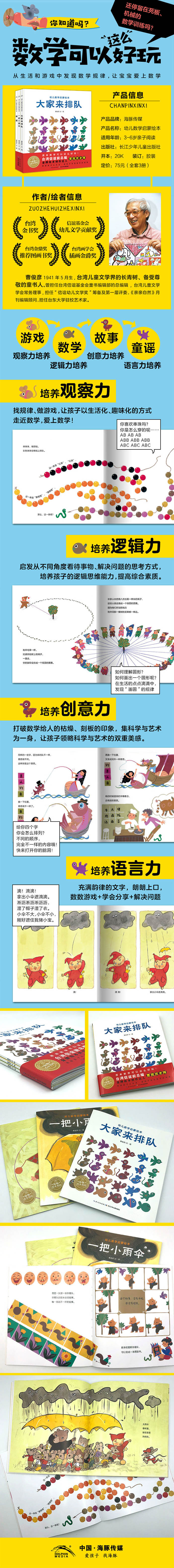 幼儿数学启蒙绘本系列三册《画圆》《大家来排队》《一把小雨伞》是一套帮助3-6岁孩子轻松爱上数学的启蒙绘本,让数学变得既简单又妙趣横生,是激发孩子们爱上数学的理想书籍。在这些故事中,通过不同形状大小比较、用身体测量等概念的独特性等主题加深孩子们对测量概念的理解。让孩子在图画中学数数,在故事中会计算,在情境中找规律,让数学变得既简单又妙趣横生,激发孩子们爱上数学。同时还引导孩子学会排队,遵守社会规则。绘者曹俊彦是台湾儿童文学界的长青树、备受尊敬的童书人,更多头衔则是台湾儿童画家、漫画家、插画家、儿童文学作家、图画作家,曾担任信谊基金会童书编辑部的总编辑、台湾儿童文学学会常务理事,担任“信谊幼儿文学奖”筹备及第一届评委。
