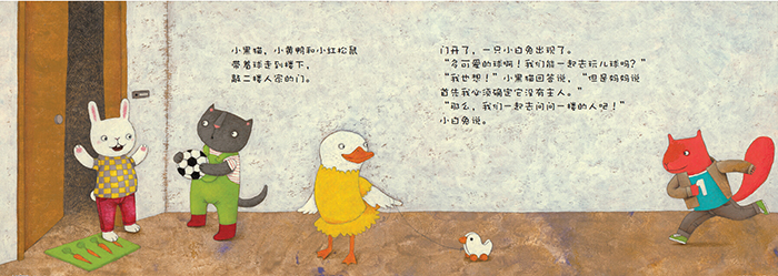小黑猫家才搬到这里三天,它不好意思挨个儿去邻居家问,可如果不问妈妈就不让它玩球。小黑猫家住楼房的顶层4楼,它要到楼下去问。球掉了,刚好撞到3楼小鸭子家的门。小鸭子开门了,说要和小黑猫一起玩球,球不是小鸭子的。于是小鸭子和小黑猫一起到2楼小松鼠家敲门,小松鼠开门了,也要和它们一起玩球,球也不是小松鼠的。它们一起到1楼小白兔家敲门,小白兔开门了,希望和大家一起玩球,球不是小白兔的。最后,四个小伙伴到底楼小刺猬家敲门,小刺猬开门了,它看见大家帮它找到了球,开心极了!