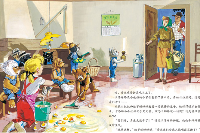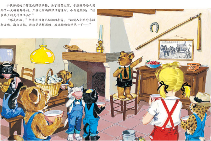 还帮忙做了好多农活:收鸡蛋、运麦捆、赶乌鸦、挤牛奶……