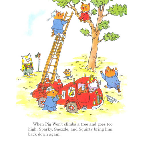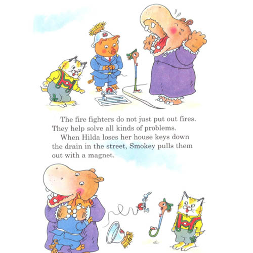 Sparky, Smokey, Snozzle, and Squirty are the valiant firepigs who keep Busytown safe. But their busy days are much more than just putting out fires. They come when Hilda drops her keys in the drain, and they help Mr. Frumble with his pickle car. It's also important that they keep the firehouse neat and clean. But, of course, putting out fires may be their most important job.