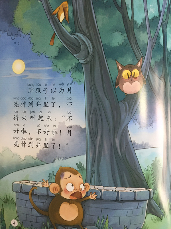 一群猴子看到井中的月亮,以为是天上的月亮掉进了井里,他们一起齐心协力捞月亮,结果发现月亮还在天上,井中不过是倒影而已。故事说明做事情要仔细观察,不要任凭虚幻的猜想就认定事物的本质。