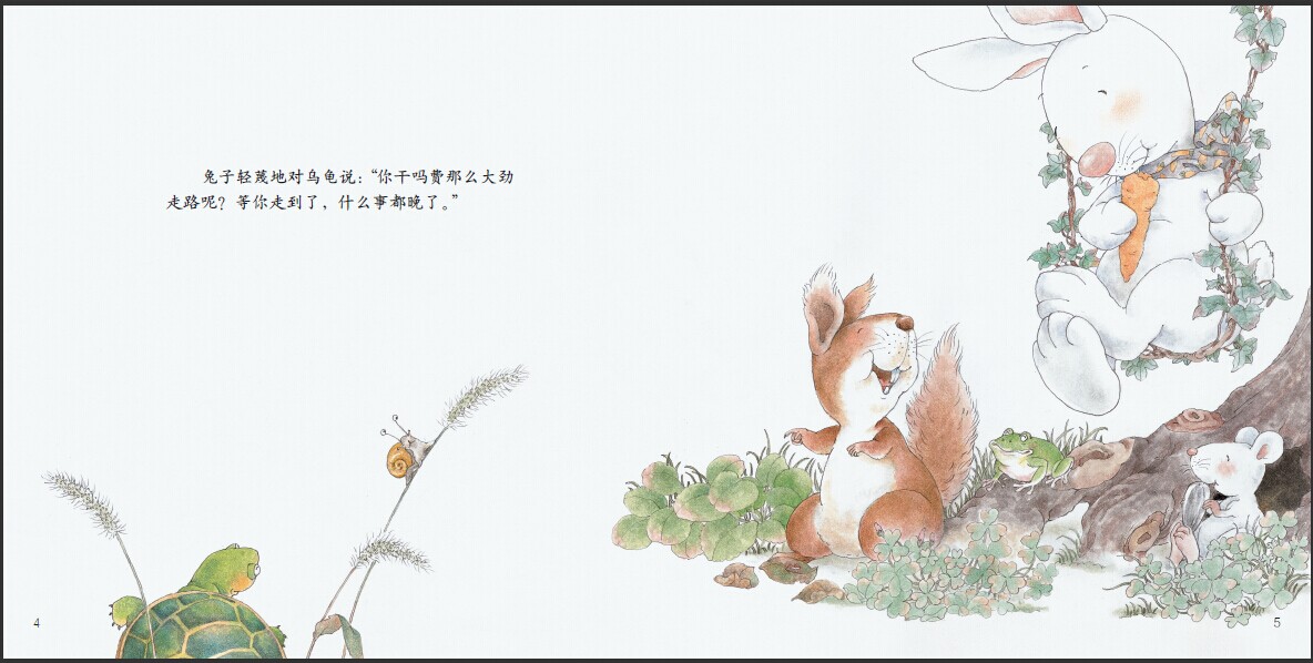 小兔子总是嘲笑乌龟走路慢,可是却在一次比赛中输给了乌龟。像乌龟一样,每个人都有他的优点,只要他足够自信并能够坚持下去,总会取得成功。同时,像兔子一样聪明的人,在保有自己的优越感的同时,也要学着去发现他人的优点。