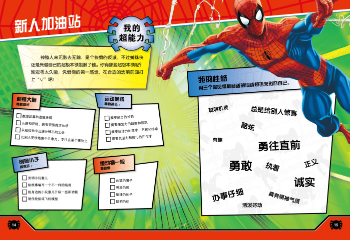 仅仅只有这些吗?当然不是!除了故事之外,还有更多的方式来传递这些宝贵的品质。在4—8岁这一年龄段,我们通过游戏环节的设置、自我评价的引导和趣味测试的带动,才能让好动爱玩的男孩们在获得快乐与智慧的同时,收获宝贵的品质。翻开这本书,男孩们通过“绝密档案”进入超级英雄的世界;在“新人加油站”完善读者个人信息,在巧妙的环节设置中挖掘自身优点,为自己加加油;紧接着,“蜘蛛侠放映厅”让男孩欣赏精彩故事,“大脑加油站”带领男孩玩游戏;“记忆力大冲关”则是以趣味测试题的方式带领男孩回顾故事情节,感受故事主角的心路历程;男孩还能在“创意竞技场”中根据step1、2、3的提示创造出一个新的反派或英雄,并发挥想象力,为这位新角色添加武器、服饰、秘密基地等关键信息。