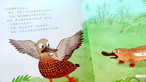 鸭嘴兽布布要找和它一样: 从蛋壳里孵出来,吃母乳的朋友。 嗯? 小鱼是卵生动物,但是它不吃母乳。 它吃水草和虫子长大。 小鸭和鸽子也是从蛋壳里出来的, 但是它们也不是吃母乳长大的。 农场里的宝宝大都是吃母乳长大的, 可是它们不是从蛋壳里出来的。 它们是在妈妈肚子里生长的。 咋? 没有找到一个好朋友呢!? 伤心的布布遇到了针鼹。