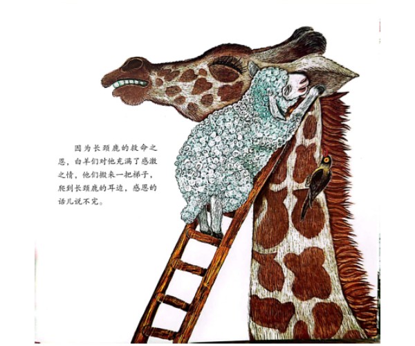 一天傍晚,长颈鹿在欣赏晚霞时,发现一群狼正奔向羊群。长颈鹿机智地把羊群带到一个安全的地方隐蔽起来,从而躲过了一劫。为了报答长颈鹿的救命之恩,白羊用自己身上的羊毛,给长颈鹿织一条漂亮的围巾。从此它们幸福地生活在辽阔的草地。