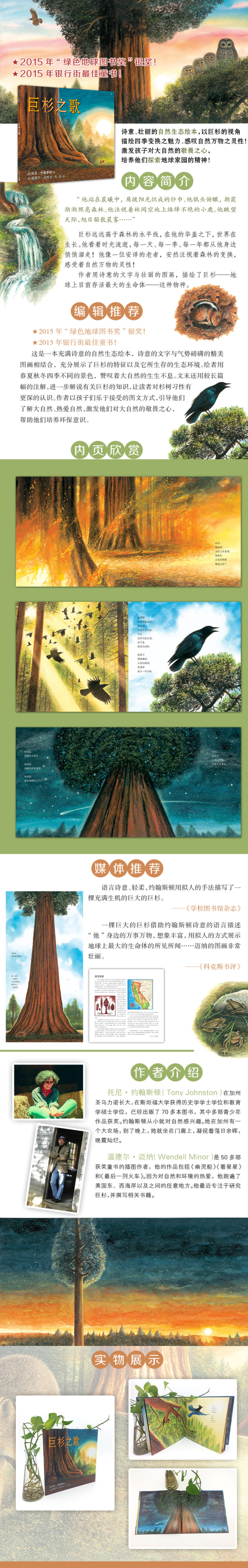 “他站在晨曦中,肩披阳光织成的纱巾。他低头俯瞰,朝霞渐渐照亮森林。他注视着林间空地上络绎不绝的小鹿。他眺望天际,旭日驱散晨雾……” 巨杉远远高于森林的水平线,在他的华盖之下,世界在生长。他看着时光流逝,每一天、每一季、每一年都从他身边悄悄溜走!他像一位安详的老者,安然注视着森林的变换,感受着自然万物的灵性! 作者用诗意的文字与壮丽的图画,描绘了巨杉——地球上目前存活*的生命体——这种物种