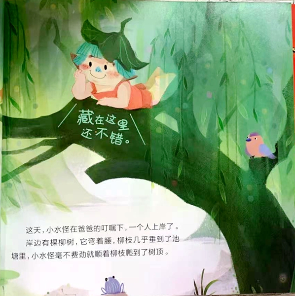这天,小水怪在爸爸的叮嘱下,一个人上岸了。岸边有棵柳树,它弯着腰,柳枝几乎垂到了池塘里,小水怪毫不费劲就顺着柳枝爬到了树顶。