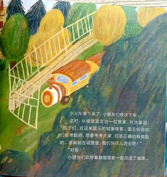 小火车停下来了,小朋友们依次下车。 这时,从城堡里走出一位管家,对大家说:“孩子们,欢迎来国王的城堡做客。国王听说你们非常聪明,想要考考大家,回答正确的有奖励哟。答案就在城堡里,我们快点儿进去吧!" "好耶!" 小朋友们欢呼着跟随管家一起走进了城堡。