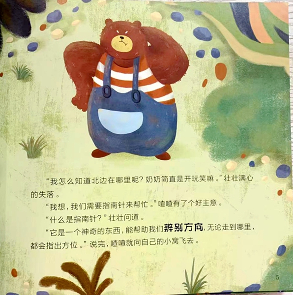 "我怎么知道北边在哪里呢?奶奶简直是开玩笑嘛。壮壮满心的失落 。 “我想,我们需要指南针来帮忙。”喳喳有了个好主意。“什么是指南针?”壮壮问道。 “它是一个神奇的东西,能帮助我们辨别方向,无论走到哪里,都会指出方位。”说完,喳喳就向自己的小窝飞去。