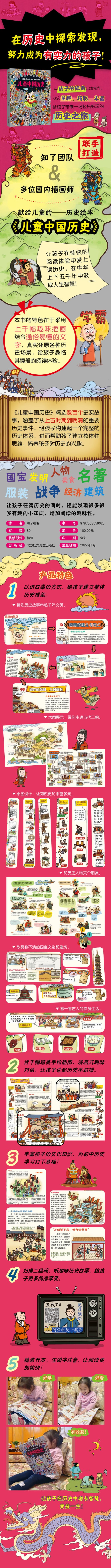 这是一本从孩子视角出发制作的历史书,由专业团队编著确保知识体系的准确性和严谨性;多位国内一线插画师手绘插图,完美细节还原历史上的重大事件、重要人物、国宝器物、历代服饰、名胜古迹等等,真正做到“画给孩子的中国历史”。按朝代划分,近1000个知识点串联起从上古时代到晚清的历史脉络,线索清晰,内容详实。不仅有每个朝代的历史事件,还有人物故事、国宝发明、古代人民的生活等,非常丰富。在绘画形式上,有趣的Q萌场景式的表现形式符合孩子兴趣与认知习惯,让孩子穿越在上下五千年的历史中,有助于培养孩子对历史的兴趣,是一套集严谨性、趣味性、实用性等一体的历史启蒙绘本。