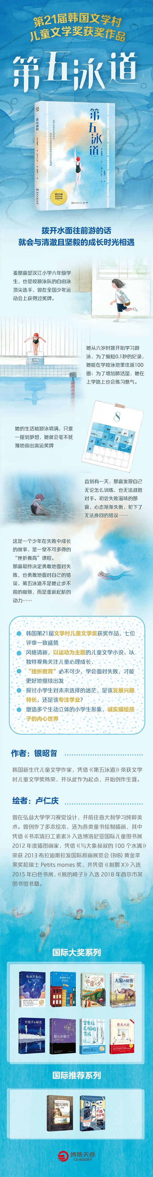 适读人群 :7-14岁 1.韩国第21届文学村儿童文学奖获奖作品,被高度称赞“这本书将为我们的少年儿童打开一扇新的大门”。 2.这是一本风格清新,以运动为主题的儿童文学小说,以独特视角关注少年儿童的身体及心理共同成长的重要阶段,直面女生成长。 3.为孩子补上重要的“挫折教育”这一课,成功固然值得欣喜,但失败也是成长中必不可少的一部分。勇于面对失败,才能更好地继续出发。 4.本书以游泳为切入点,也讨论了小学生对中学生活以及未来的迷茫,是该发展兴趣特长,还是该专注学业?这个话题能够在学生群体和家长群体中产生大众共鸣。 5.极具画面感的架构和叙事节奏,清新的文字交织着少年的友情、梦想、苦恼、挫折以及若隐若现的情愫等等,涵盖了每个孩子小学时期都会经历的心理历程,容易引起读者共鸣。