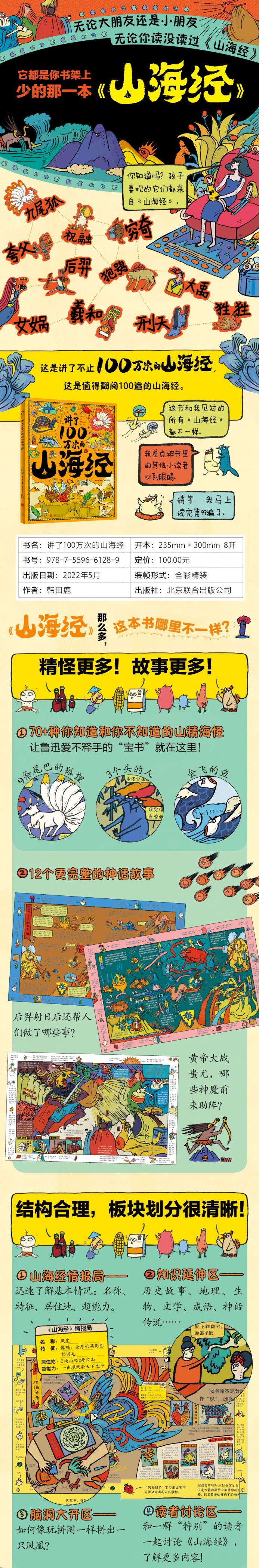 《山海经》是一本旷世奇书,也是中小学课外阅读。书里不仅记载了许多脍炙人口的神话传说,还描绘了很多形态各异的山精海怪以及有着奇特外貌的异人。羲和浴日、后羿射日、大禹治水、精卫填海、凤凰、九尾狐、穷奇……我们耳熟能详的故事原来都出自《山海经》,就连文学大家鲁迅也为它深深着迷,称它为“宝书”。 《山海经》里看似荒诞不经的内容是我们中华民族宝贵的精神财富,即使到了现代,它依然展示着蓬勃的生命力,很多影视剧、小说里的精怪形象都来源于它。 这本《讲了100万次的山海经》以《山海经》原文为蓝本,将晦涩难懂的古文重新梳理,以新时代下孩子们能够理解的新视角切入,把通俗易懂的语言和夸张好玩的插图有机结合起来,让孩子可以轻松读懂山海经。除了各种精怪和神话传说,本书还整合了其他古代文学作品中与《山海经》有关的内容作为拓展内容,从而让孩子更加深刻地理解《山海经》对于后世文学的重大影响。作为一本上古奇书,《山海经》里有很多不易阅读的生僻字,本书也标注了拼音。