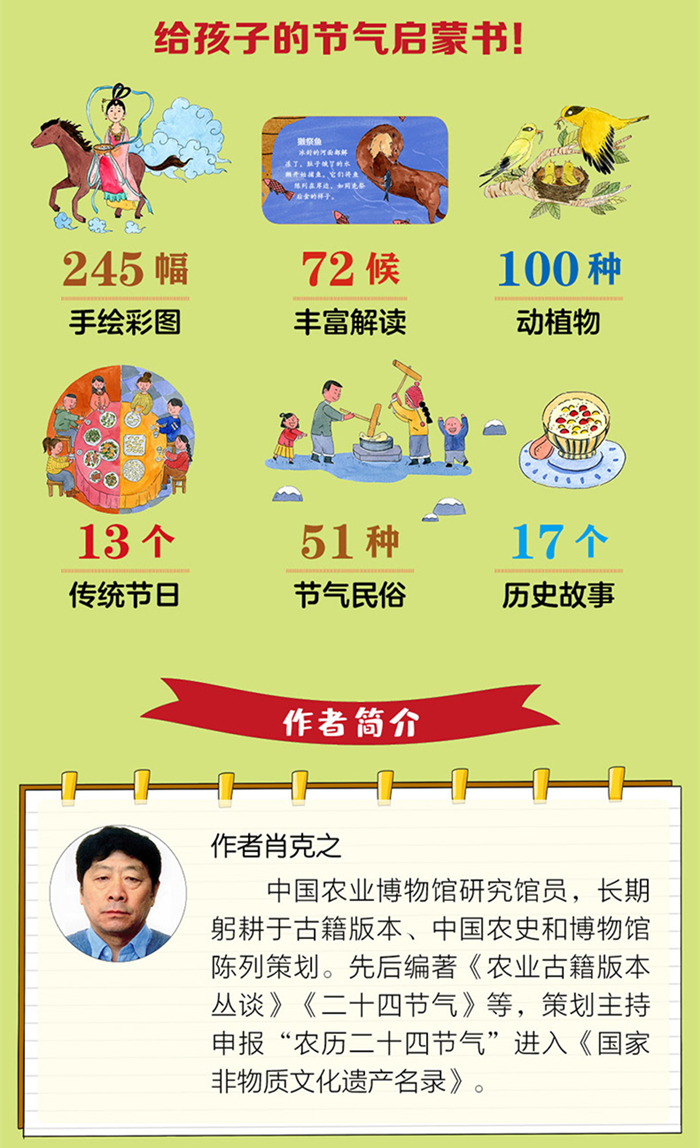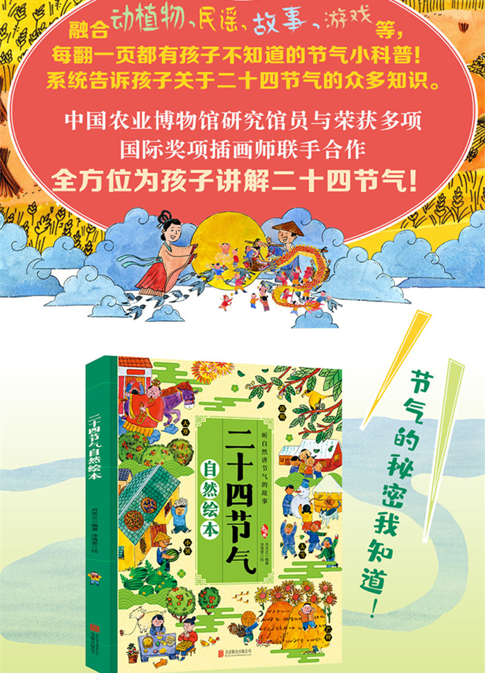 本书是专为3-6岁孩子设计的中国孩子的节气之书,把二十四节气做成适合孩子阅读的百科绘本,激发孩子对中国文化与二十四节气的兴趣,并对它们有一定的了解。本书主要介绍了二十四节气的农事、民俗、科普,以及对各节气特色的深入介绍。时令、气候和物候,各类节气活动、科学实验、时令作物、动物习性,从谚语到游戏,简单好玩,让节气更靠近孩子的世界。并有大量手绘插图,对孩子的独立探索性、求知欲等多方面都有培养价值。并用各种有趣的节气小知识带给孩子大大的乐趣。