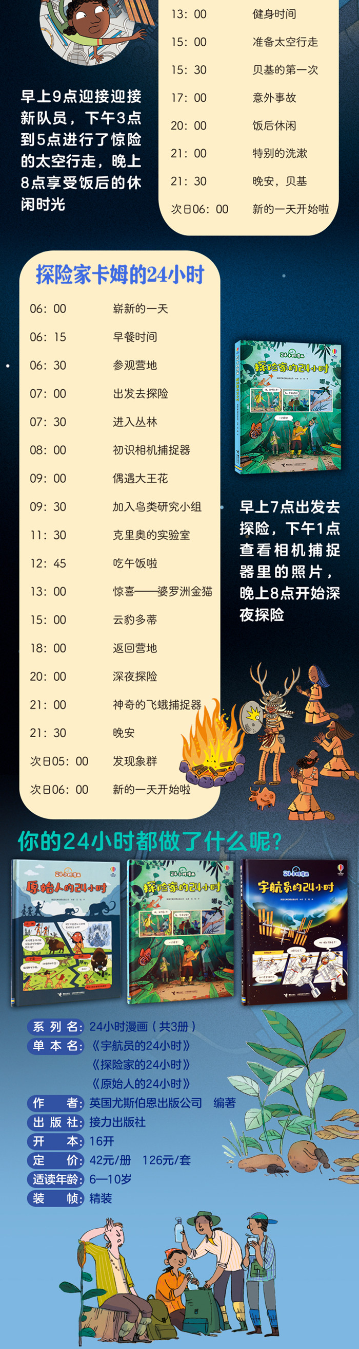 《探险家的24小时》 是一本适合6—10岁孩子阅读的充满趣味性和故事性的科普漫画书,将丛林探险这一庞大主题浓缩进24小时中。主人公卡姆致力于成为一名探险家。本书记录了他的次丛林探险,向小读者们展示了生活在丛林中的科研人员们一天的生活,科普知识都渗透在生活场景中,让孩子在阅读故事的过程中轻松学到知识。