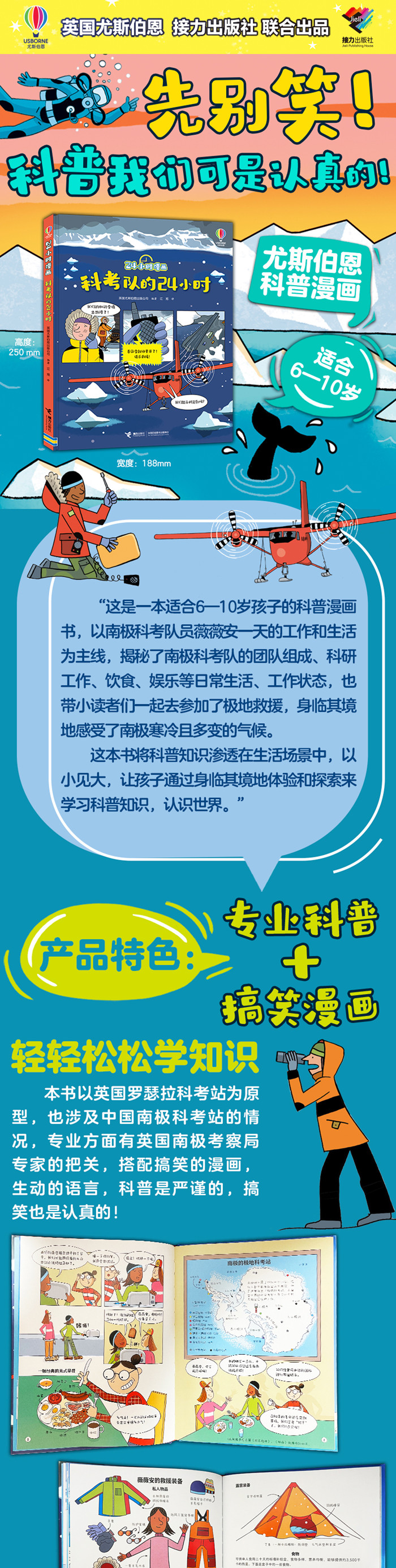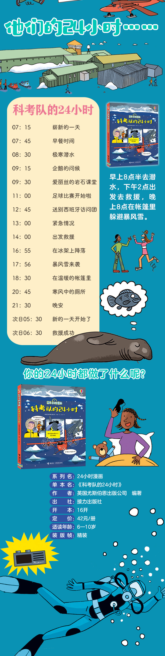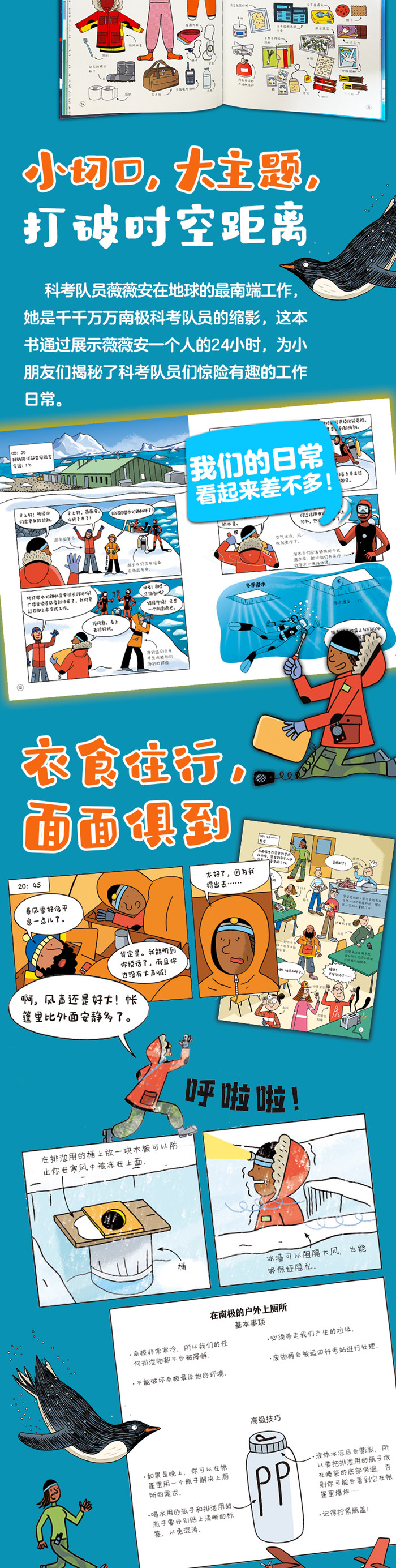 《科考队的24小时》是一套适合6—10岁孩子阅读的充满趣味性和故事性的科普漫画书。主人公薇薇安是一名在南极科考站工作的机械师,本书通过介绍薇薇安一天的生活,向小读者们展示了南极科考队的团队组合、科研工作、饮食、娱乐等日常生活状态。科普知识都渗透在生活场景中, 寓教于乐,让孩子在阅读故事的过程中轻松学到知识。
