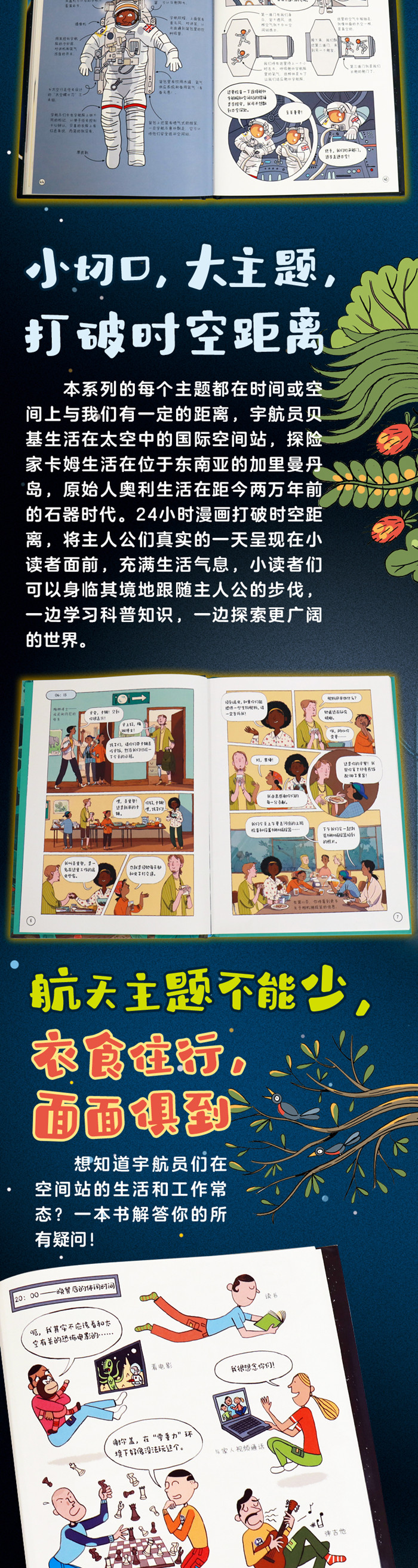 《宇航员的24小时》是一套适合6—10岁孩子阅读的充满趣味性和故事性的科普漫画书。主人公贝基是一名在国际空间站执行任务的宇航员,本书通过介绍贝基一天的生活,向小读者们展示了空间站中的生活场景,还带领小读者们进行了一场惊心动魄的太空行走。科普知识都渗透在生活场景中,让孩子在阅读故事的过程中轻松学到知识。