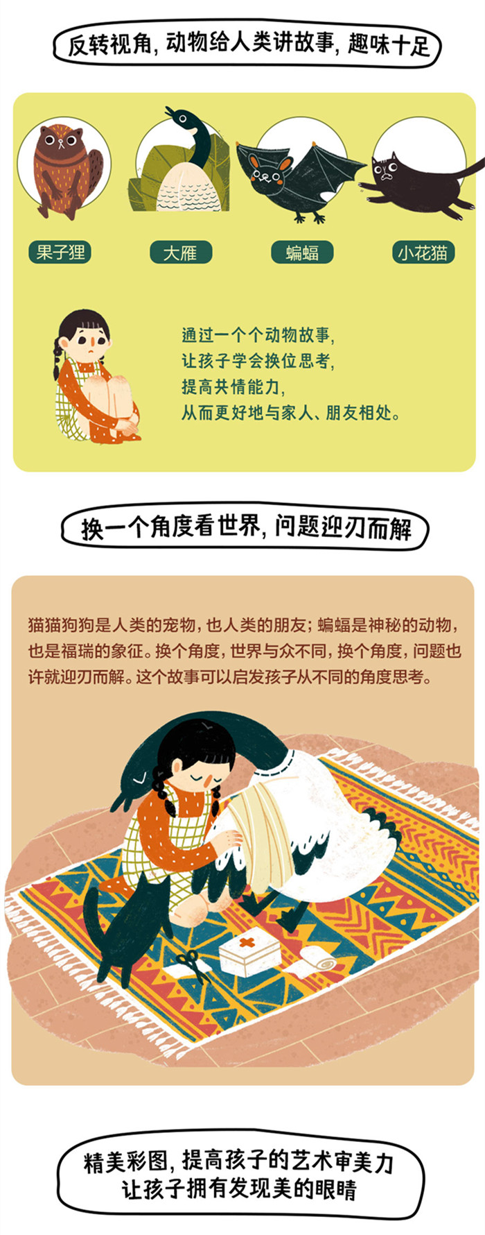 新冠疫情发生以来,我们付出了巨大的代价。如果追溯病源,部分线索会指向“野味产业”。一些人身上存在的“猎奇”“炫耀”“野味滋补”等畸形消费观,使得一些野生动物沦为餐桌上的野味。在畸形的消费观下,野生动物苦苦挣扎,人类罹患疫病,这让人愤怒、忧伤。也让我们更寄希望于孩子。儿童绘本《是朋友,不是野味》就是在这种境况下创作出来的,它改编自中国儿童艺术剧院朗诵剧《唤“福”——梦中童话》。作者通过一只从剪纸窗花“五福临门”中活过来的蝙蝠和一个因为疫情而隔离在家的小女孩的视角,讲述了果子狸、大雁、蝙蝠等野生动物在人类世界的遭遇,呼吁大家关爱野生动物,因为保护野生动物就是保护自己。作者希望以野生动物的生存现状和人类在自然中的位置作为人生启蒙,在孩子幼小的心灵上培植对生尊重,对自然的感恩,使得孩子们在接受生命教育洗礼的同时,启迪智慧的成长。