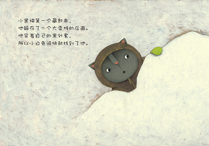 这一天下了大雪,小白兔穿着厚厚的雪白棉衣,小黑猫穿了厚厚的漆黑外套,尽管天气很冷,它们却觉得又暖又舒服。它们在雪地里玩起了捉迷藏,黑乎乎的小猫一下就被找了出来,可是小黑猫怎么也找不到雪白的兔子。小黑猫认为这样不公平。它们决定到地下室玩捉迷藏,可是里面黑乎乎的,雪白的小白兔一下就被找了出来,可是小白兔怎么也找不到小黑猫。