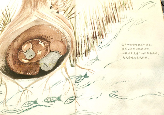 有一只叫埃里克的针鼹鼠因为身上全是尖刺,朋友们一和他拥抱就被刺得落泪、朋友们甚至逃跑。埃里克非常沮丧、非常失落。可是,爸爸说,针鼹鼠就是一个不需要拥抱的物种。爸爸的话也不能安慰小埃里克,埃里克还是很想获得朋友们的拥抱。他跑进丛林深处,他身上的尖刺帮他避开毒蛇、老鹰、蝎子,经历了一系列磨砺,针鼹鼠发现,尖刺也挺好的,他慢慢接受自己。还发现,虽然他不能和朋友们拥抱,他可以亲吻亲人和朋友!他找到了自己。