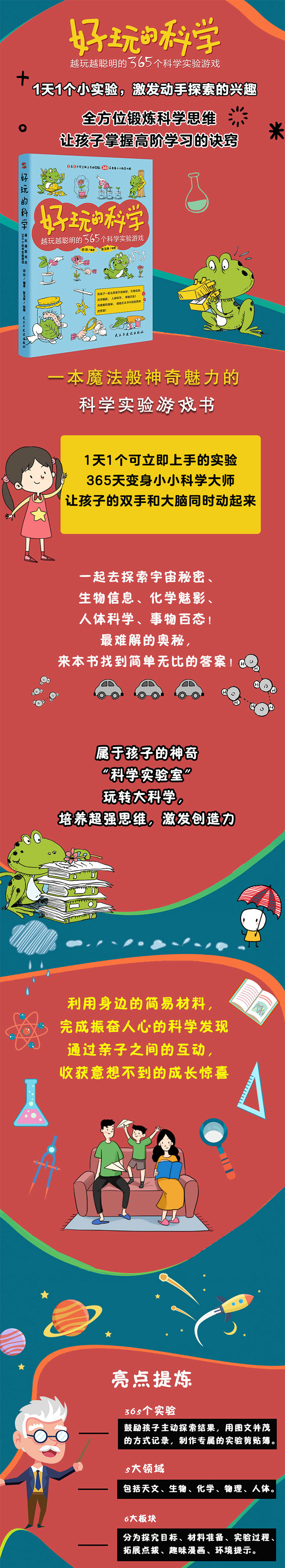 《好玩的科学:越玩越聪明的365个科学实验游戏》是一本非常有趣的科学实验书,它通过一个个简单易懂的科学实验来讲述日常生活中的科学原理,不仅能充分激发孩子们的好奇心,尽情拓展科学视野,也是小学生不可缺少的科学课外读物。这本书囊括天文、生物、化学、物理、人体五大类,使用的材料在身边各处都能找到,让孩子轻松阅读、轻松上手。 365个实验 鼓励孩子主动探索结果,用图文并茂的方式记录,制作专属的实验剪贴簿 5大领域 包括天文、生物、化学、物理、人体 6大板块 分为探究目标、材料准备、实验过程、拓展点拨、趣味漫画、环境提示