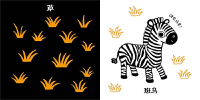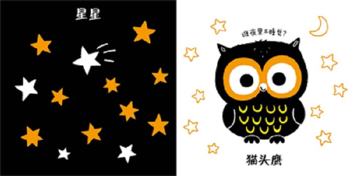 小宝宝对对比色特别敏感,特别是黑白对比——有什么比白天和黑夜、光明和黑暗对比更强烈的呢!这本书非常特别又非常简洁,所有的形象都特意设计成黑白对比的图案。宝宝在爸爸妈妈的陪护下翻看这本书,可以在这个方寸世界里认识物质、形状和图案。