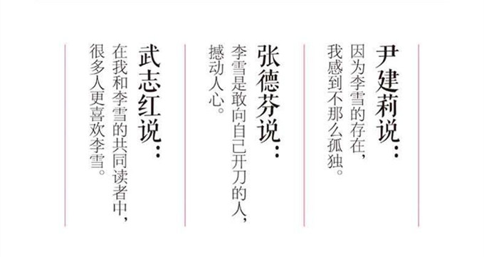 尹建莉说“因为李雪的存在,我感到不那么孤独”;张德芬说李雪是“敢向自己开刀的人,撼动人心”;武志红说“在我和李雪的共同读者中,很多人更喜欢李雪”;读者说“五体通泰,初尝自由”,所谓盛誉不过如此。