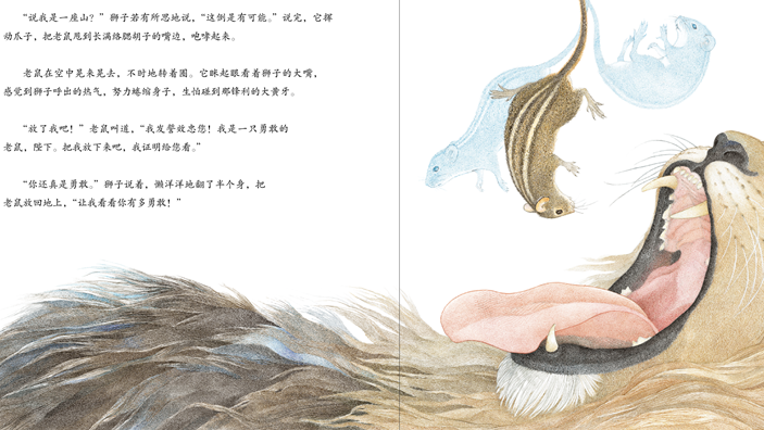 2. 画面华美精细,气势恢宏,让读者尽享视觉盛宴。作者南希•埃克霍尔姆•伯克特的插图把老鼠和狮子身上的每一根毛发都绘制得栩栩如生,场景或精细或宏大,让读者不知不觉地沉浸在非洲大草原的美景之中。