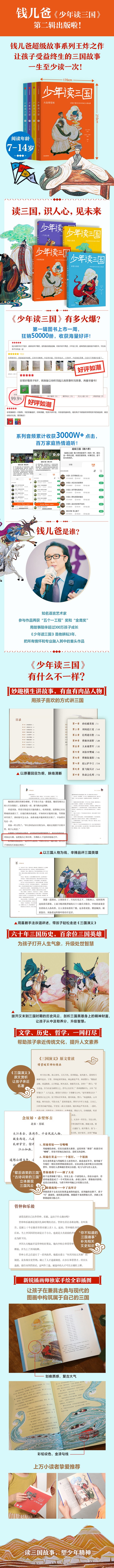 《少年读三国》是语言艺术家钱儿爸精耕三年,专为7—14岁少年打造的《三国演义》系列故事书。辑4册主要讲述从“桃园三结义”到“诸葛亮出山”之间的故事,出版后深受读者喜爱,获得好评无数。第二辑共4册,分别为《火烧博望坡》《赤壁大决战》《三气周公瑾》《刘备入西川》。 在编著此书的过程中,钱儿爸将所有情怀和专业融入其中,首先依据《三国演义》原著回目,为孩子清晰展示阅读脉络;同时,从儿童的阅读逻辑出发,轻尔虞我诈的权谋,重精彩纷呈的故事,用浅显但不乏幽默、诙谐又透出机智的语言讲述出一部波澜壮阔的三国故事。 钱儿爸讲三国故事,妙趣横生;说三国英雄,有血有肉。在他的层层剖析之下,读者既能读透《三国演义》的故事,更能洞察故事背后蕴藏的历史经验和文化内涵,从而收获受益终生的处世智慧。 作者简介