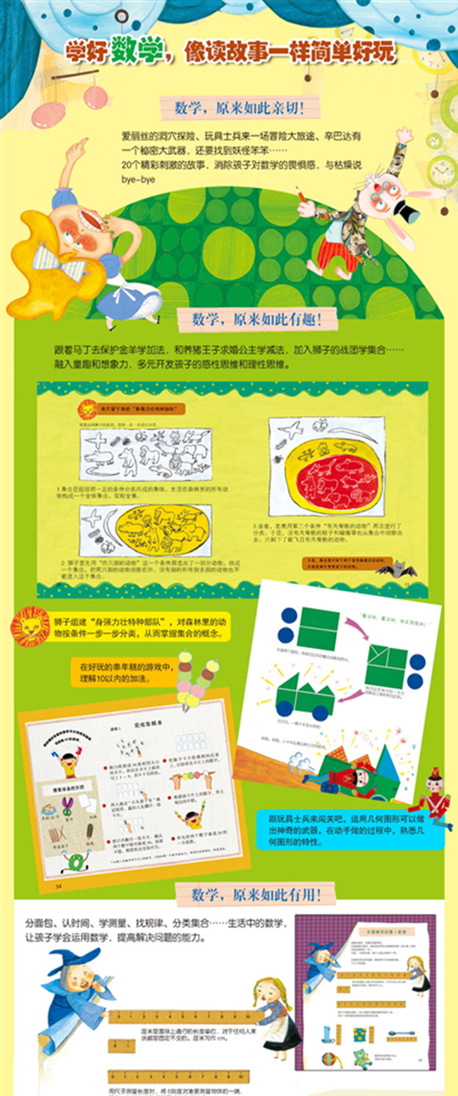 玩具士兵用几何魔法块完成历险,灰姑娘在长度精灵的帮助下、克服继母的刁难,辛巴达的秘密武器打开一个神奇的世界……在一个个新意迭出又冒险刺激故事里,籍由孩子爱看故事的“本能”,让孩子在轻松有趣的故事里激发学习数学的兴趣。
