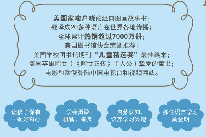 1.美国家喻户晓的经典图画故事书; 被陆续翻译成20多种语言在世界各地传播; 全球累计热销超过7000万册。