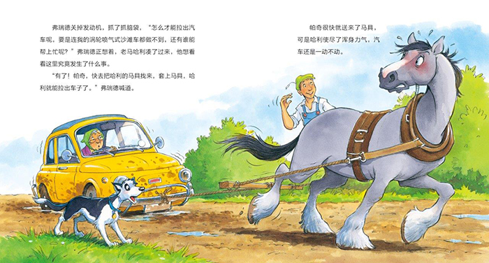 有一天,希尔德姨妈的汽车陷进泥坑里了,怎样才能把汽车拉出来呢?