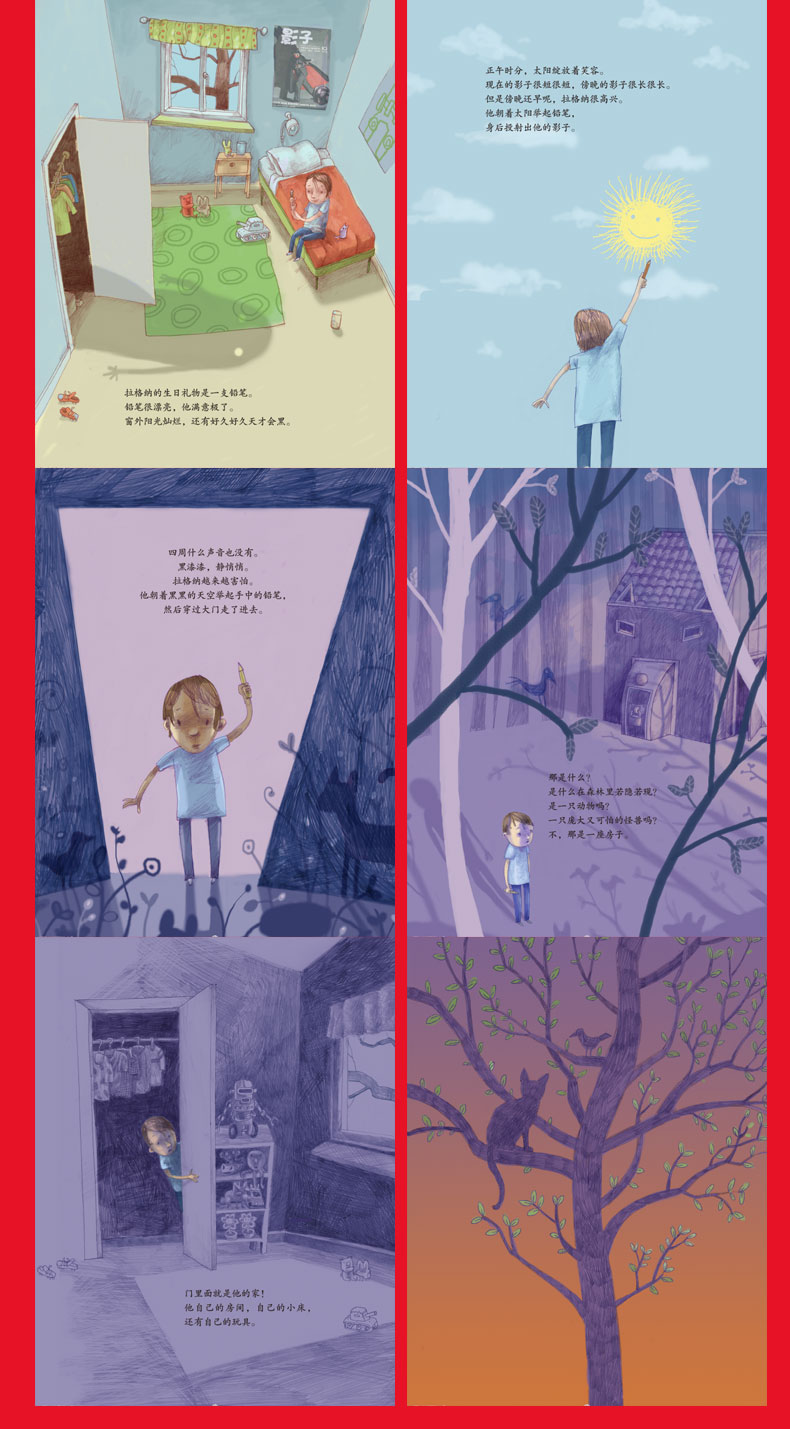 拉格纳的生日礼物是一支铅笔。铅笔很漂亮,他满意极了。窗外阳光灿烂,还有好久好久天才会黑。拉格纳一直在屋外画画。他画了一座房子,一架秋千,还有一家他经常光顾的热狗店。天渐渐黑了,影子越来越长。树枝组成的影子森林里,藏着一座房子。推开门进去,里面充满了拉格纳画的各种东西,小屋啦,小鸟啦,小猫啦,云朵啦。最后拉格纳画了一扇门,回到了自己的房间。从此,拉格纳再也不怕天黑了。这是一本极具想象力的绘本,帮助孩子战胜怕黑的心理。